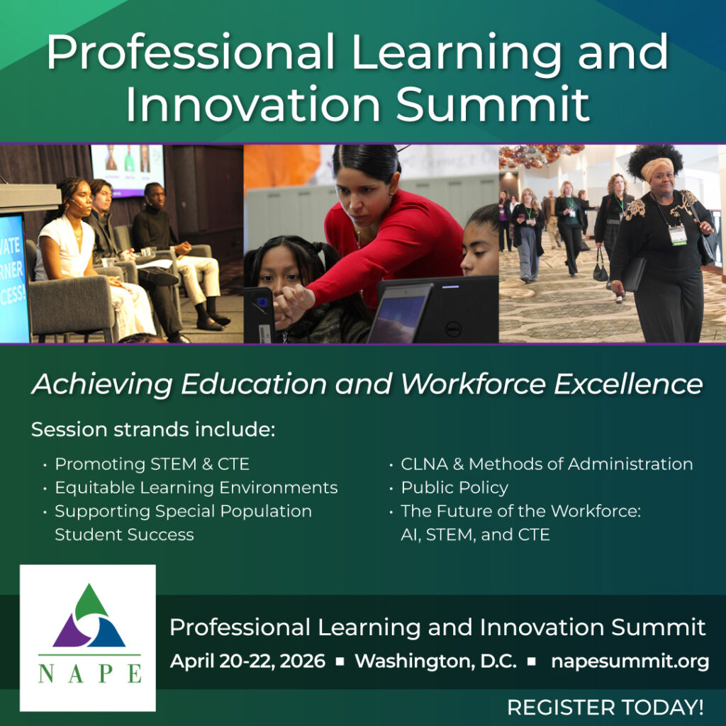 Join the NAPE for the annual Professional Learning and Innovation Summit, in Washington, DC, April 20-22, 2026. Learn strategies to increase our collective capacity to transform education and workforce systems to ensure every student thrives and has pathways to an equitable workforce. To learn more, visit napesummit.org.